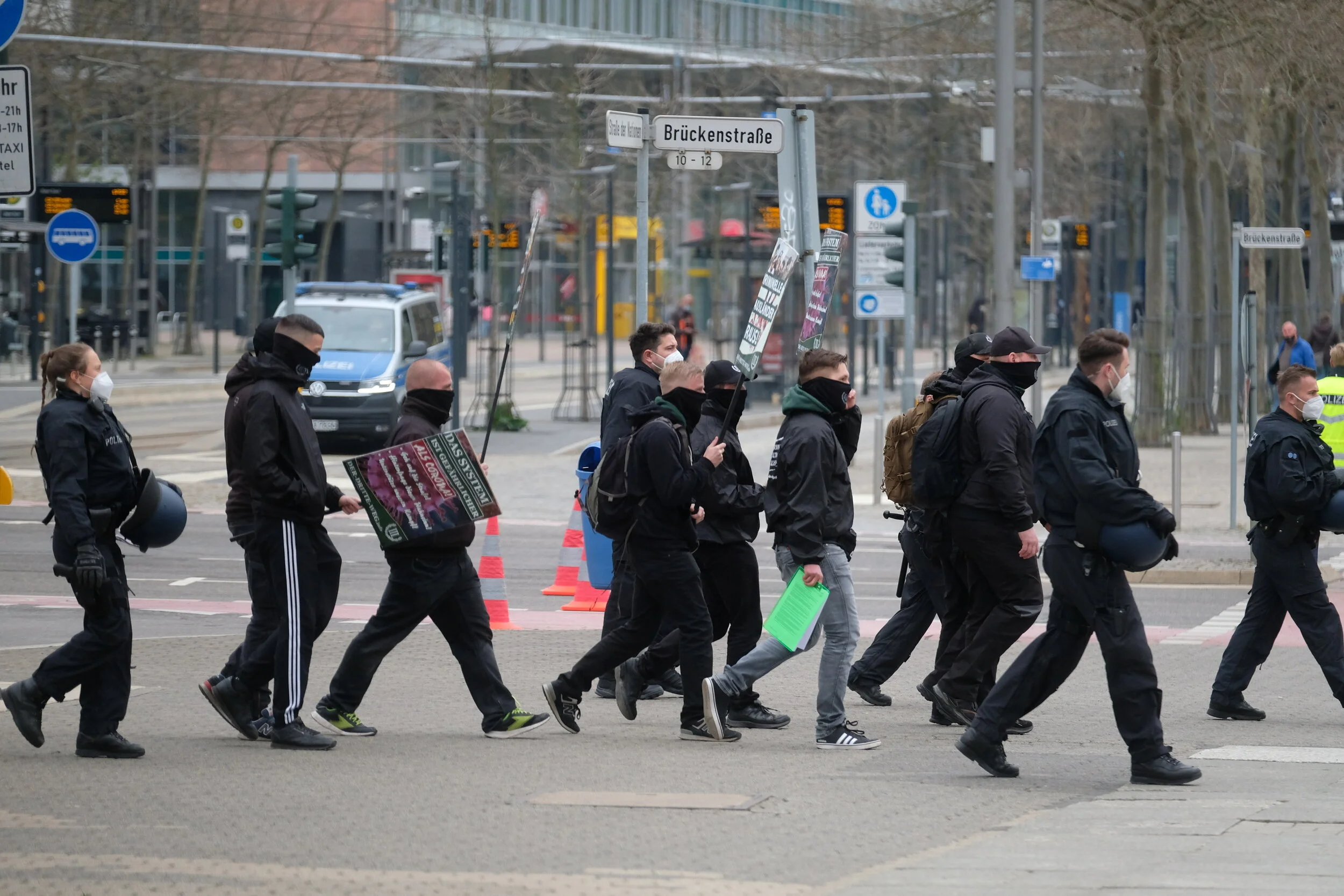 May 1, 2021, Chemnitz. Supporters of the far-right party "Der III. Weg" are escorted by the police to a rally of the party "Free Saxony". Sebastian Willnow/picture-alliance/dpa/AP Images